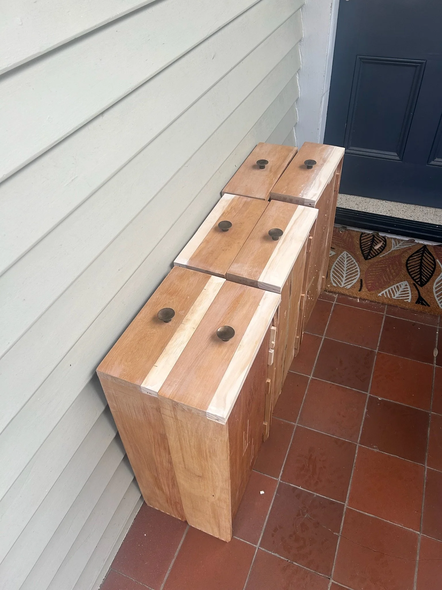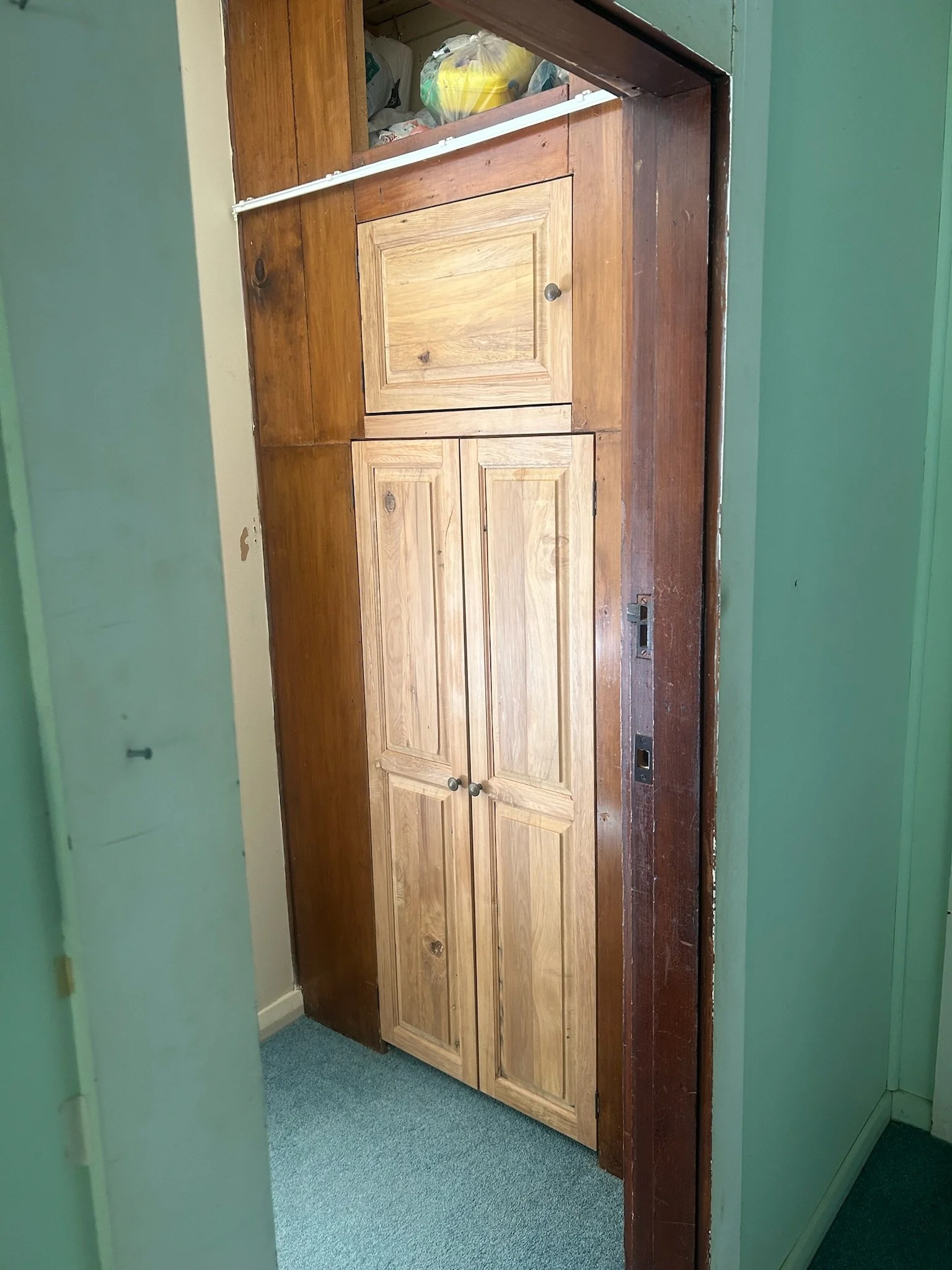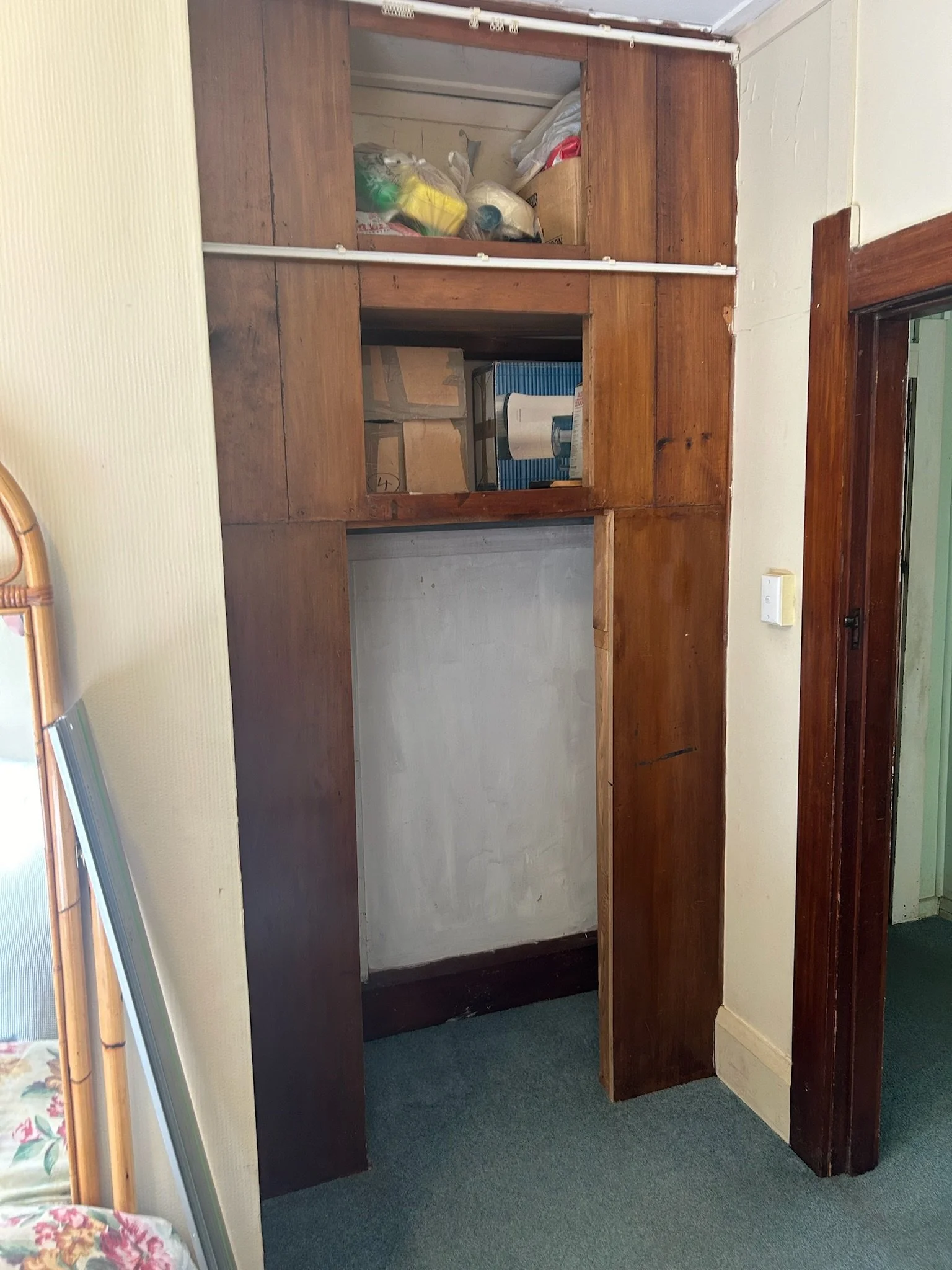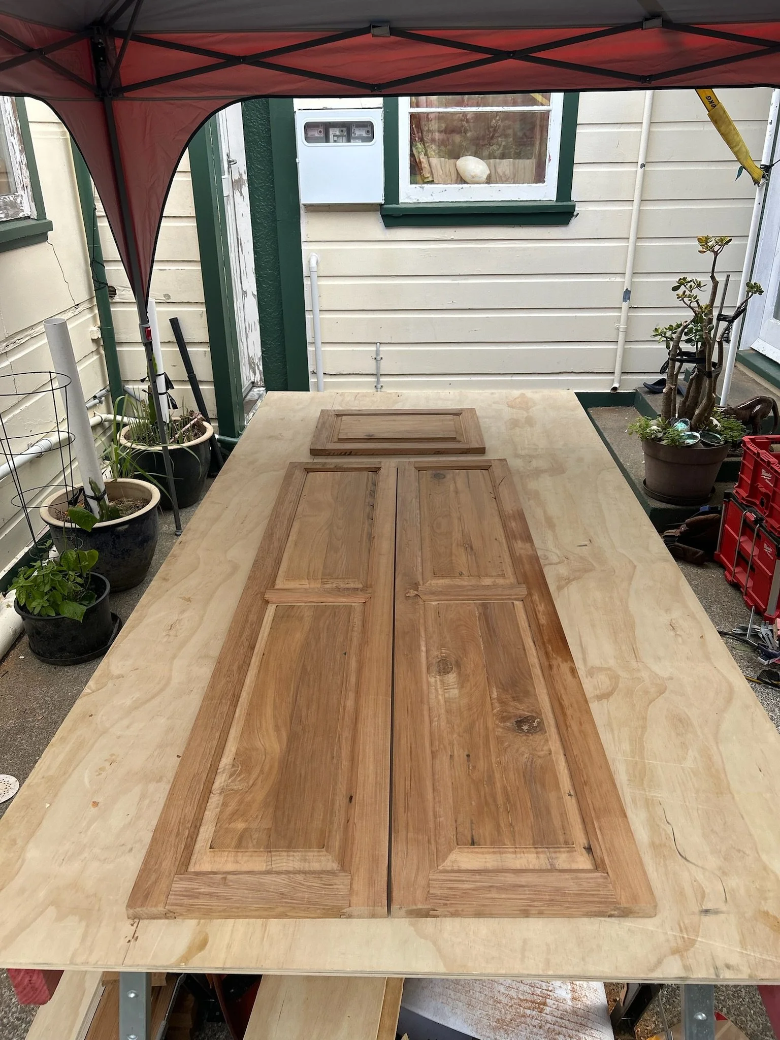 Pre installation of reclaimed rimu wardrobe door and cabinet.