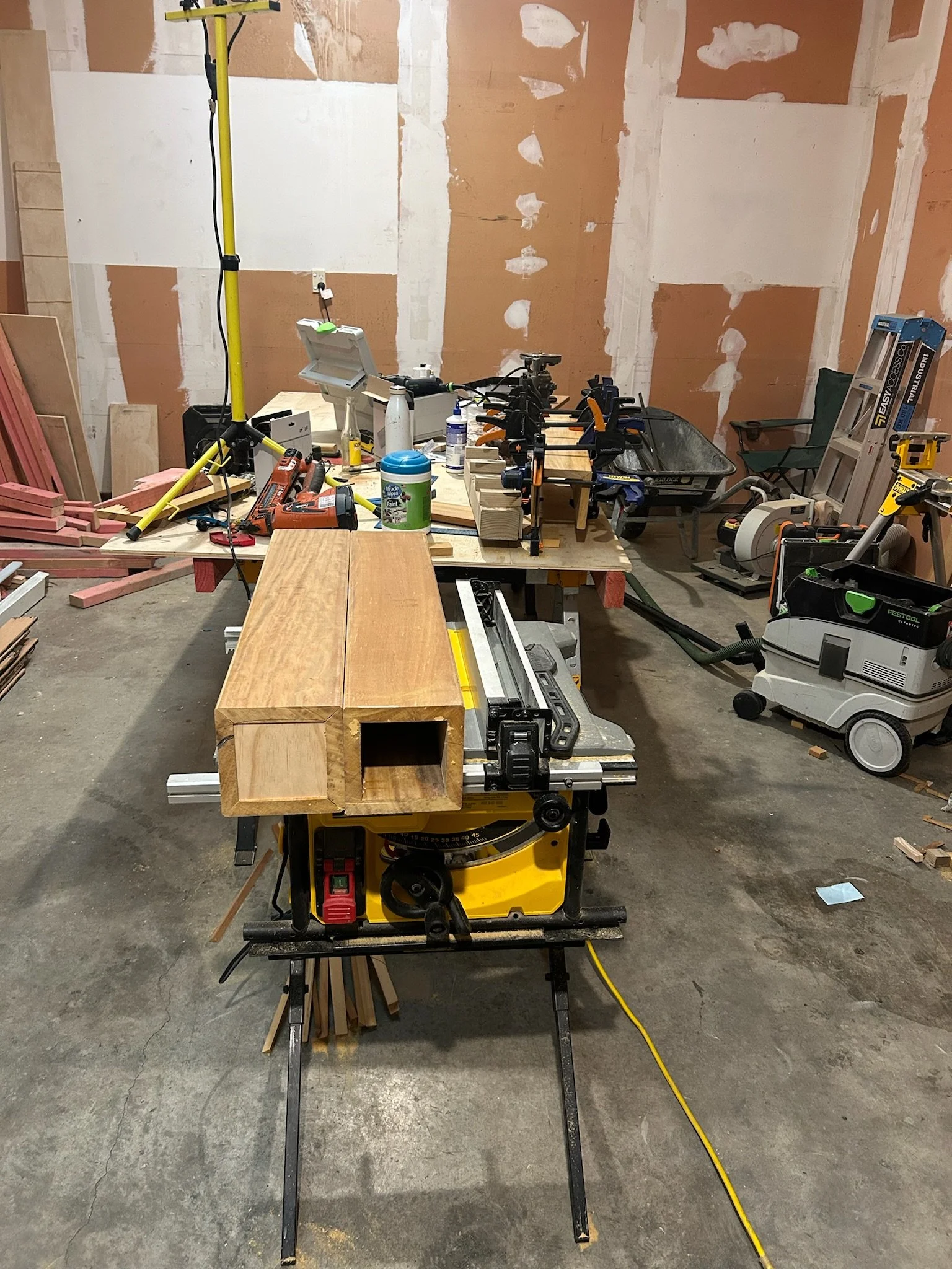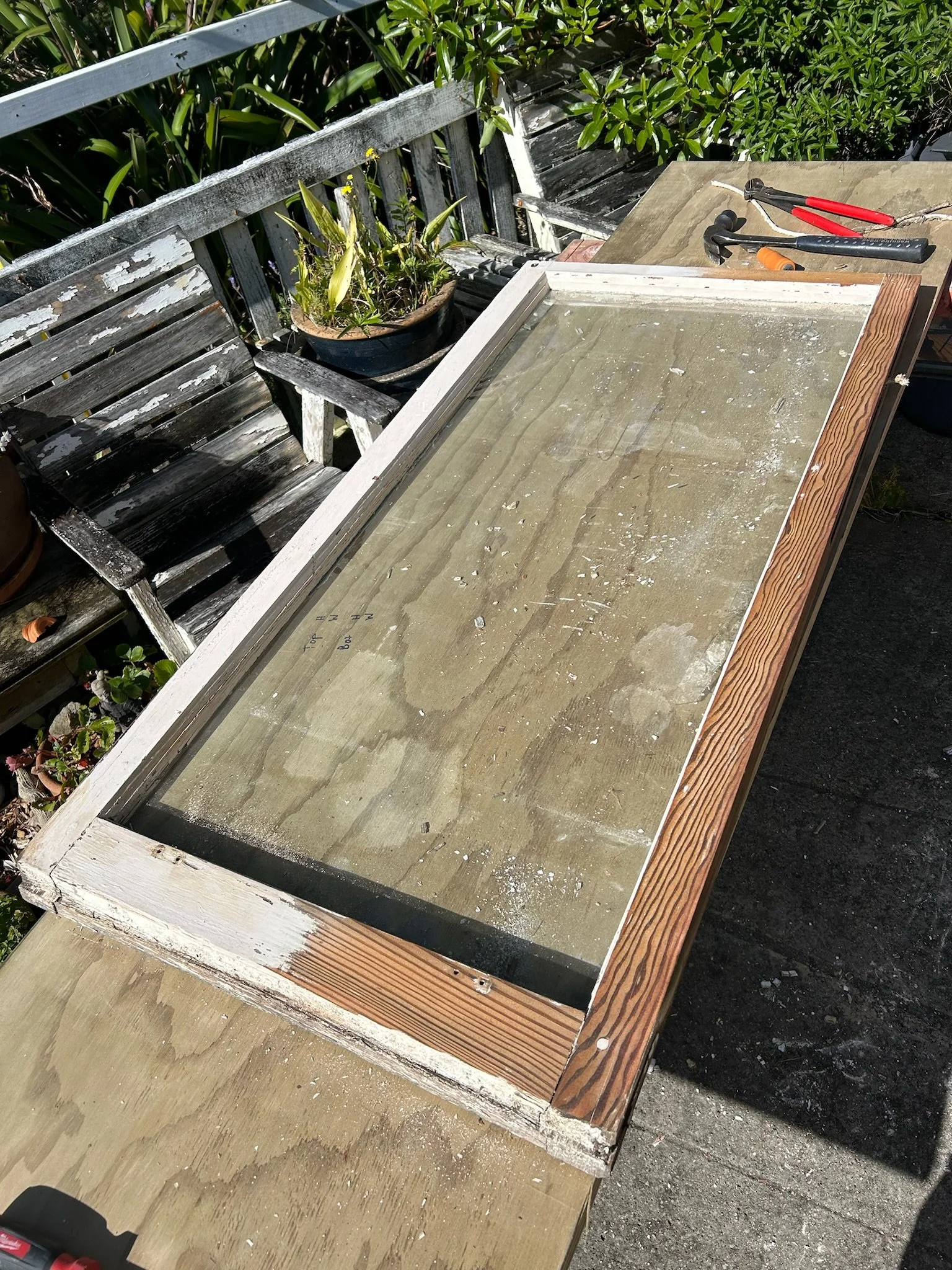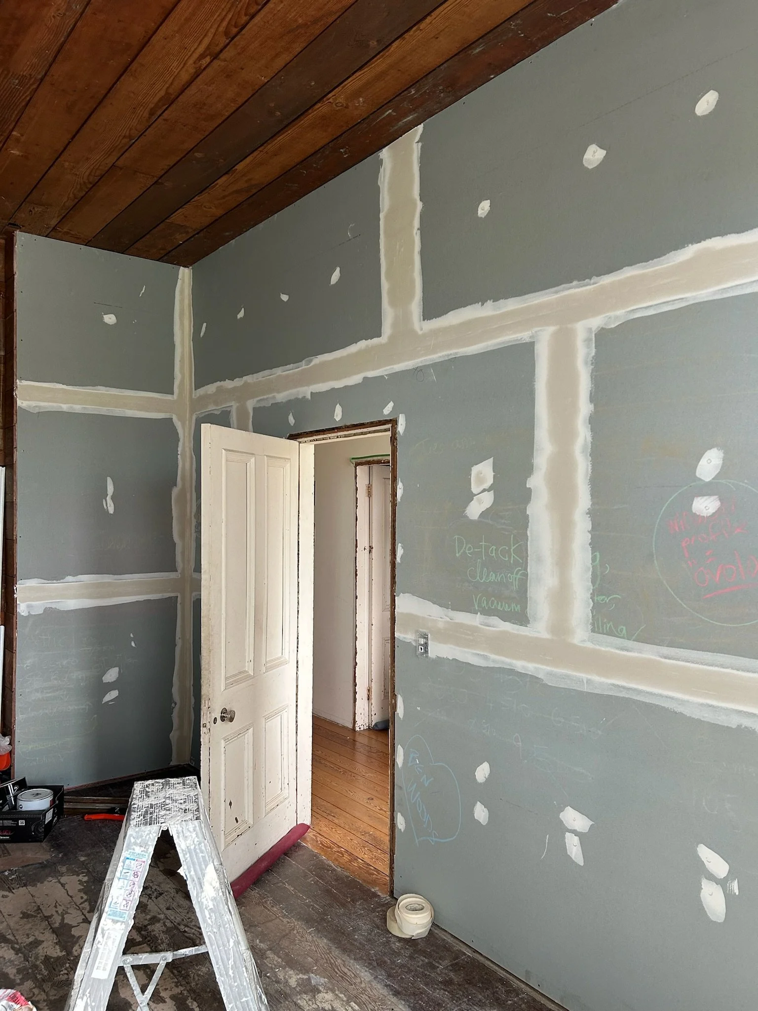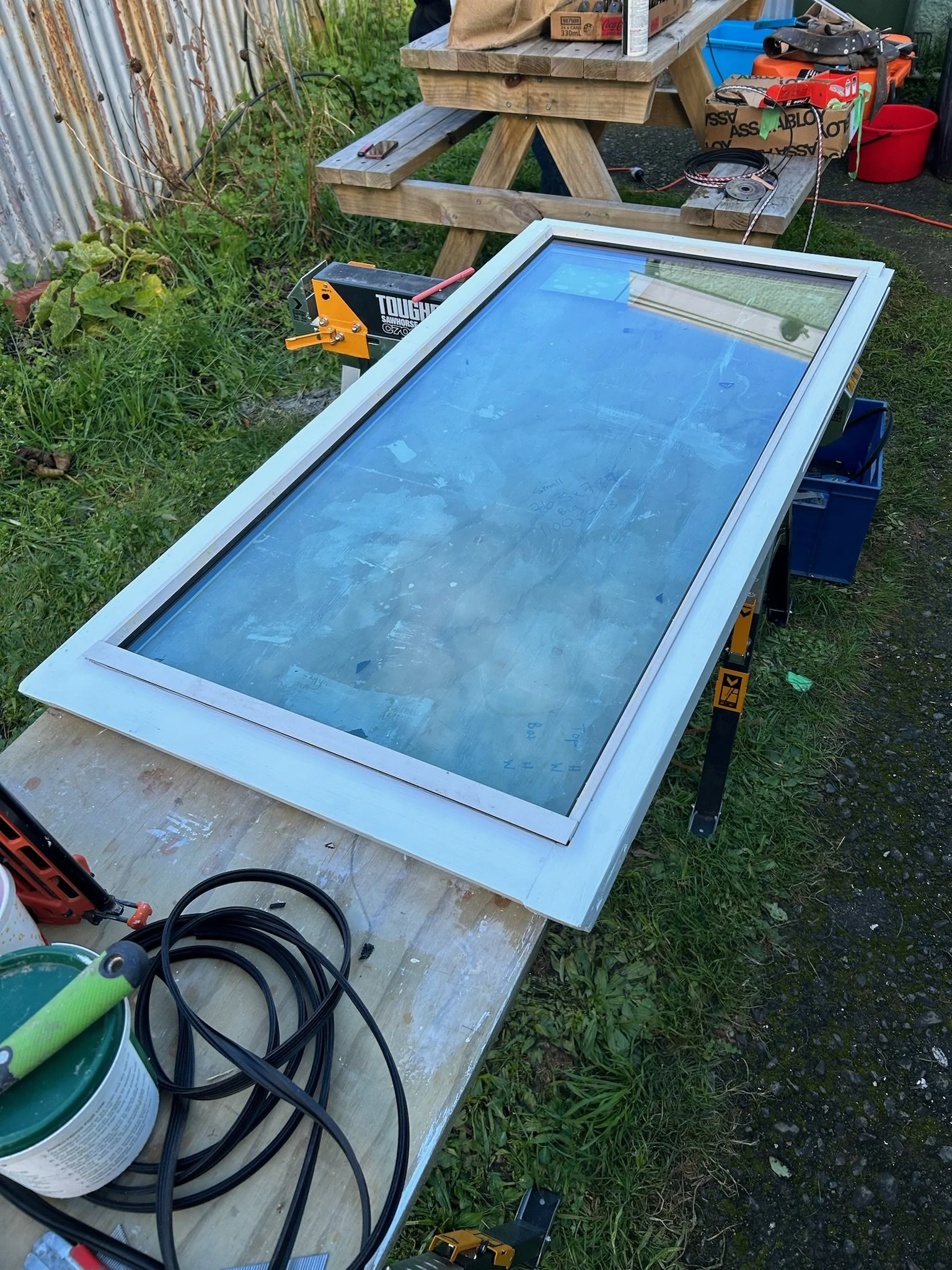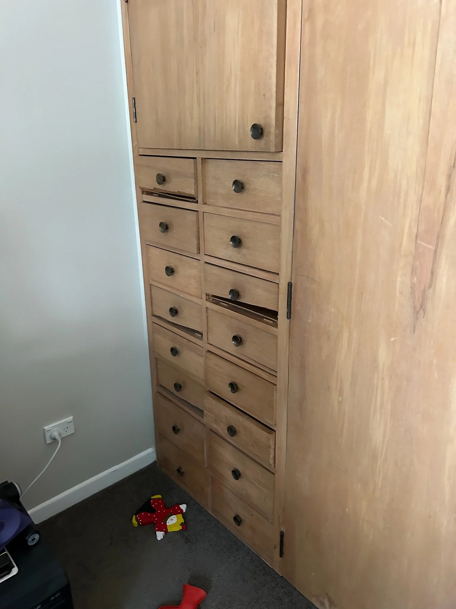 Pre installation of reclaimed rimu wardrobe door and cabinet.